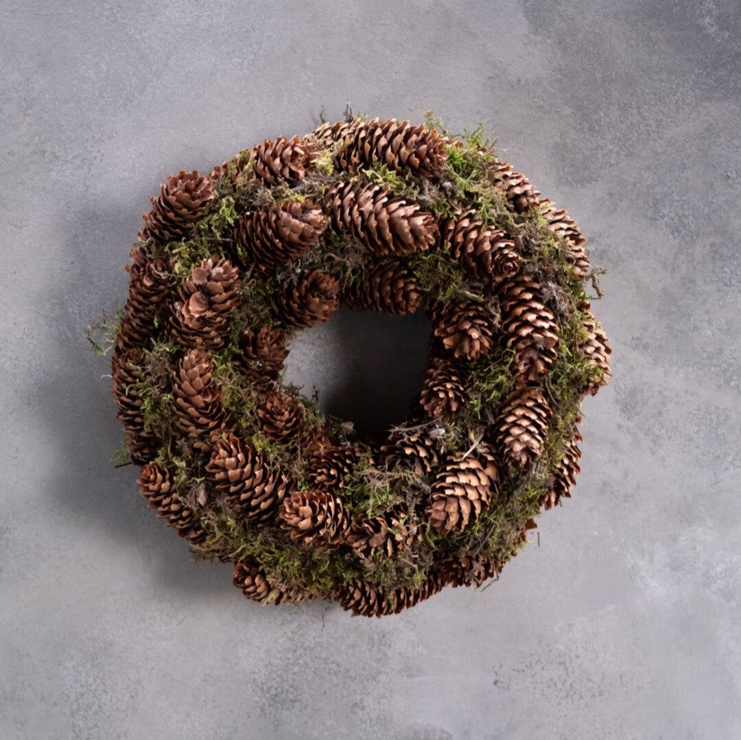 Dennenappelkrans mooi in natuurlijke eenvoud, tijdloos en passend in elk kerstinterieur.
