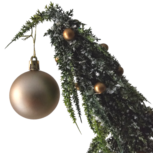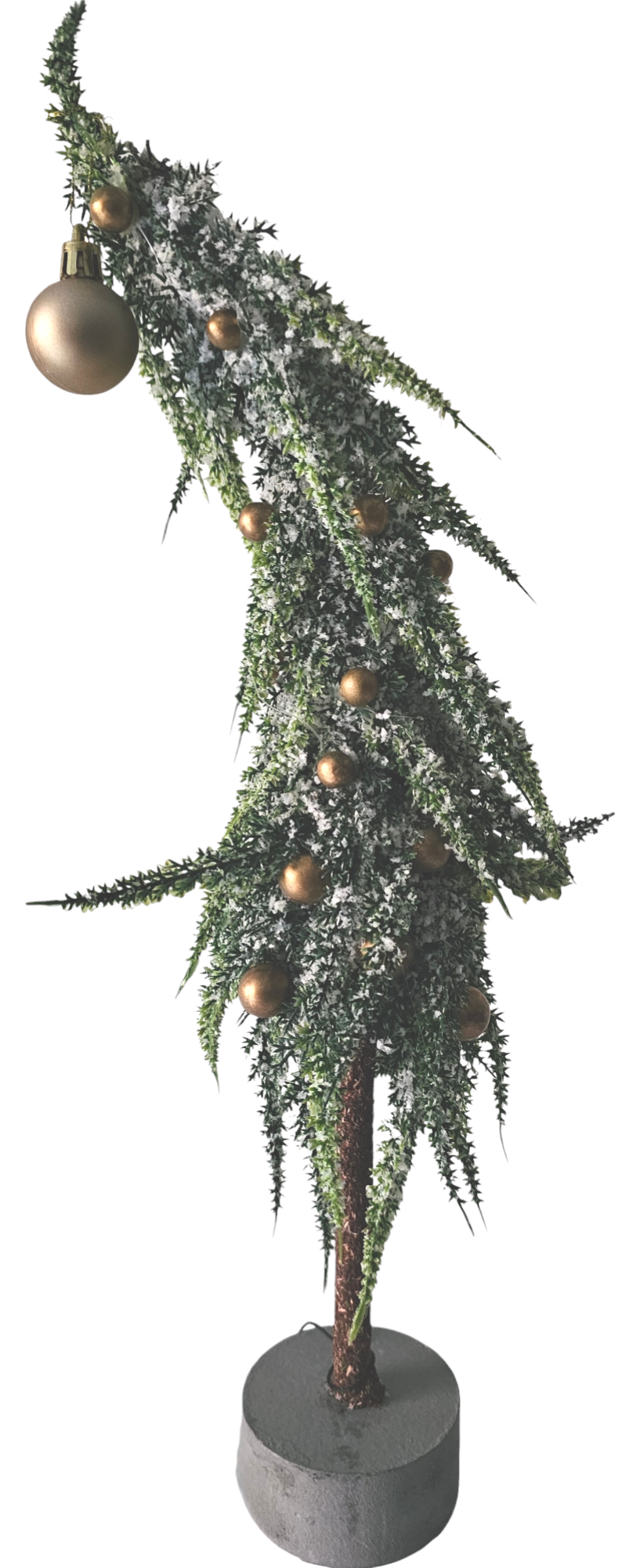 Deze groene en gouden nep-groenblijvende boom met een houten basis en sneeuwafwerking is een feestelijk en elegant stuk dat elke ruimte zal verfraaien.