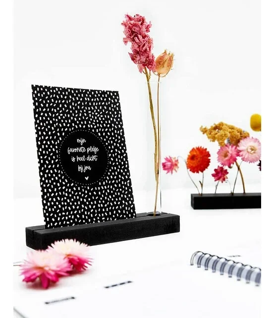 Mooie zwarte houten kaartenhouder met vaasje. Een kaarthouder om een mooie kaart of foto een bijzonder plekje te geven. In de kaartenhouder zit een gleuf waar je een eigen kaartje of foto in kunt zetten (de kaart en de bloemen op de foto zijn niet bijgesloten).
