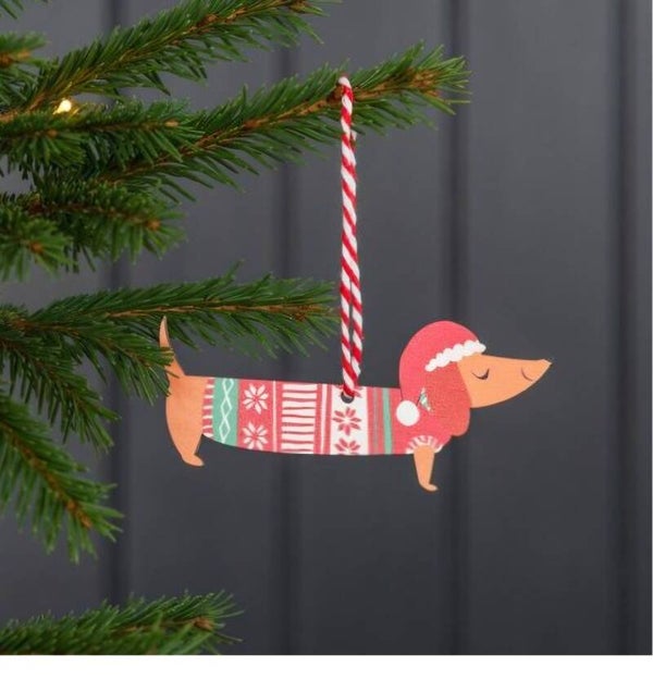 Een houten hanger van een teckel die helemaal zin heeft in Kerst De hanger is aan beide zijden bedrukt .