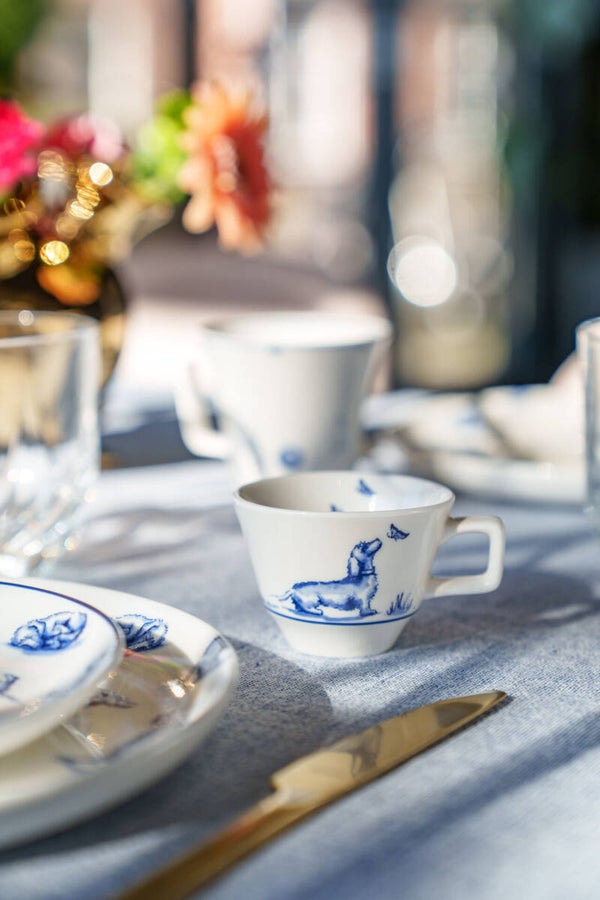 Van dit porseleinen espressokopje word je gegarandeerd vrolijk. De speelse teckel is heerlijk aan het genieten in de buitenlucht.