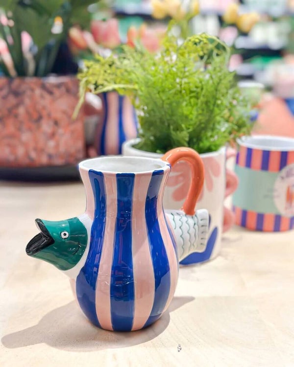 Geef je interieur een kleurrijke twist met deze handbeschilderde keramieken kan van Kersten. Met zijn speelse visdesign en vrolijke strepen is dit decoratieve item perfect als vaas, waterkan of blikvanger op tafel.
