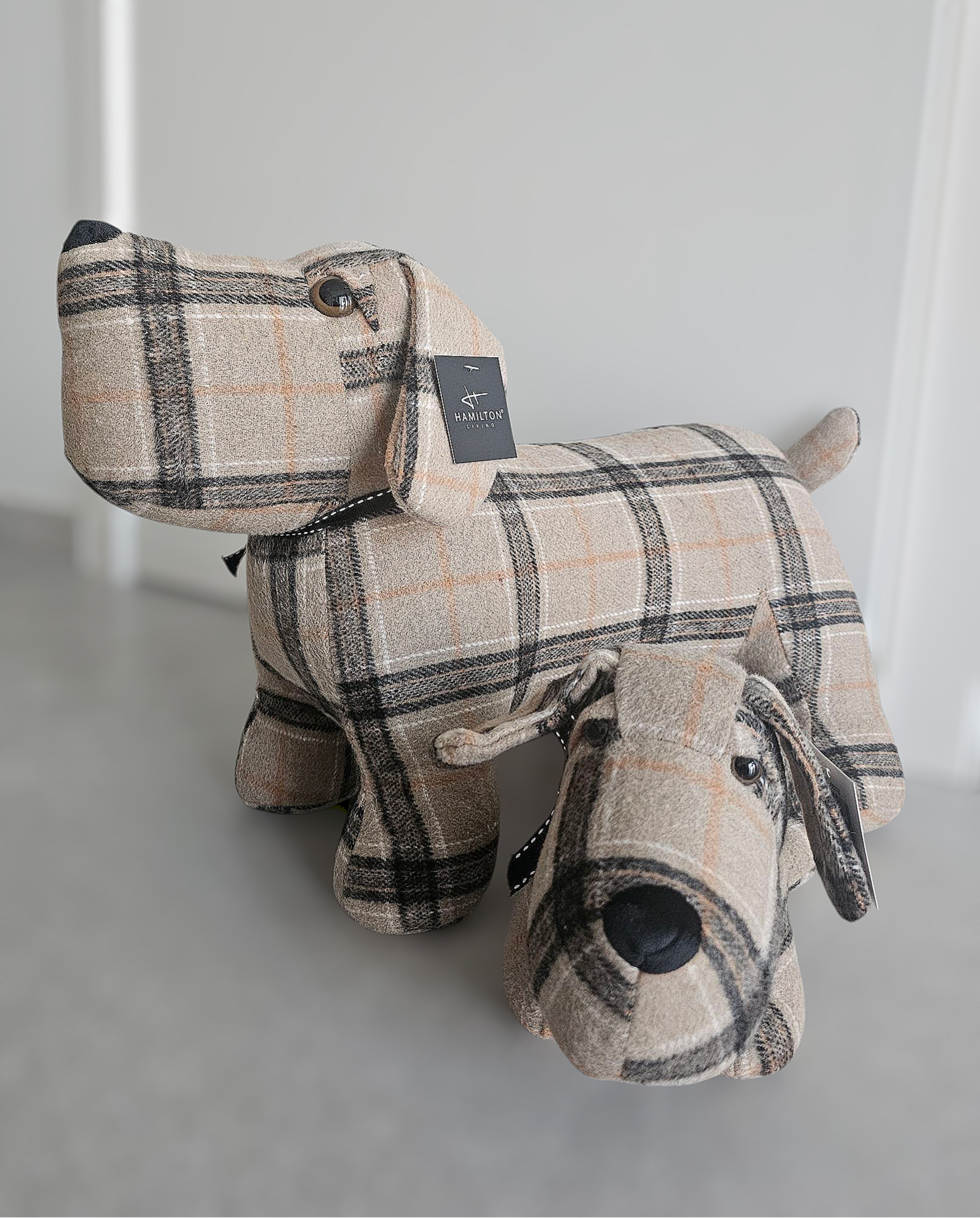 Maak kennis met Dog Leo, de charmante deurstopper in teckelvorm die niet alleen je deur op zijn plek houdt, maar ook je interieur opfleurt! Gemaakt van een zachte wolmix met een trendy Schotse ruit, is deze trouwe viervoeter even praktisch als decoratief.