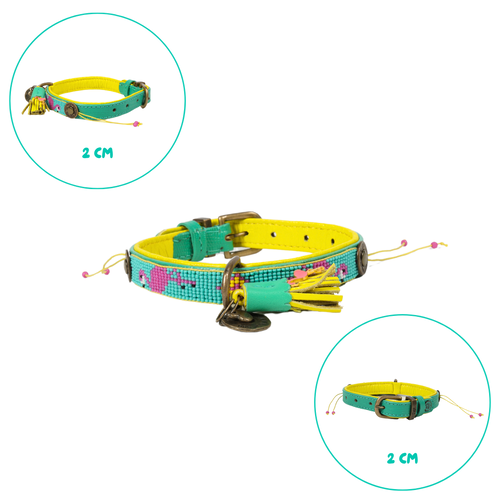 Geef je hond een unieke look met de Chogogo halsband van Dog With A Mission (DWAM). Deze bohemian halsband is handgemaakt van stevig leer en versierd met vrolijke flamingo’s, turquoise accenten en een speels leren kwastje. Perfect voor honden die mogen opvallen! Dankzij de verstelbare pasvorm en duurzame materialen is deze halsband niet alleen stijlvol, maar ook comfortabel en geschikt voor dagelijks gebruik.