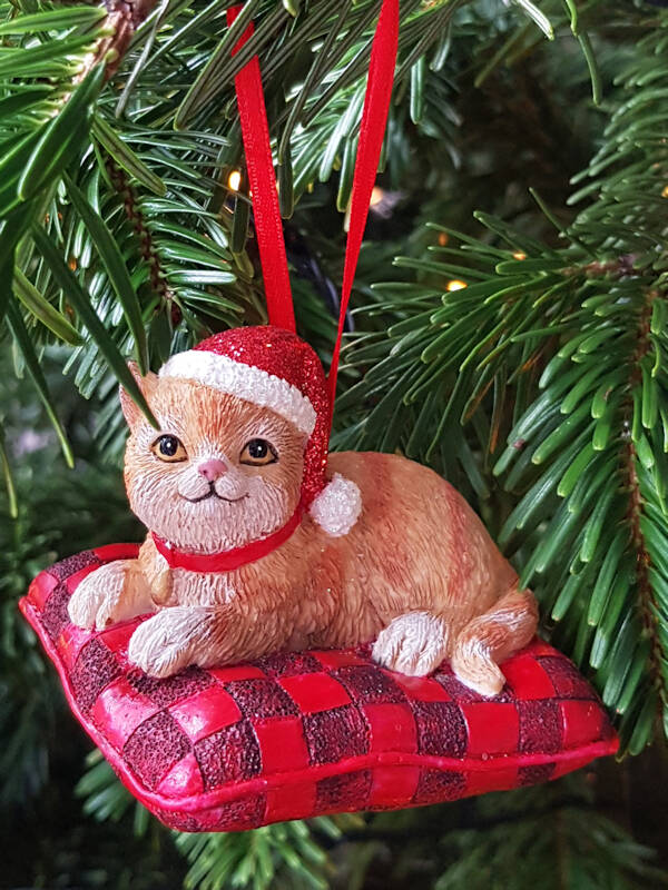 Deze schattige rode kat op een kussen brengt direct warmte en gezelligheid in je kerstboom. Het kerstornament is gemaakt van kunststof en heeft een handgeschilderde uitstraling, waardoor het een speelse, unieke toevoeging is aan je kerstdecoratie. Perfect voor kattenliefhebbers of als vrolijk detail in een speelse boom.