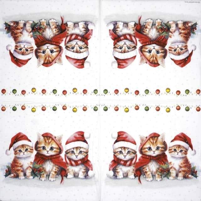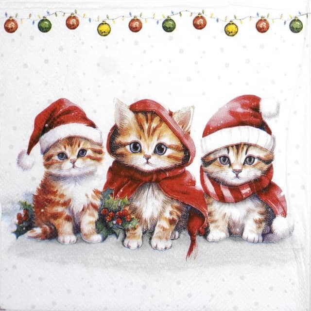 Laat je tafel stralen met de servetten Christmas Kittens. Deze feestelijke set van 20 servetten toont een groep onweerstaanbaar schattige kittens – allemaal met een vrolijke kerstmuts op. Hun speelse poses en lieve snuitjes zorgen voor een glimlach bij elke gast en brengen direct een knusse kerstsfeer in huis.