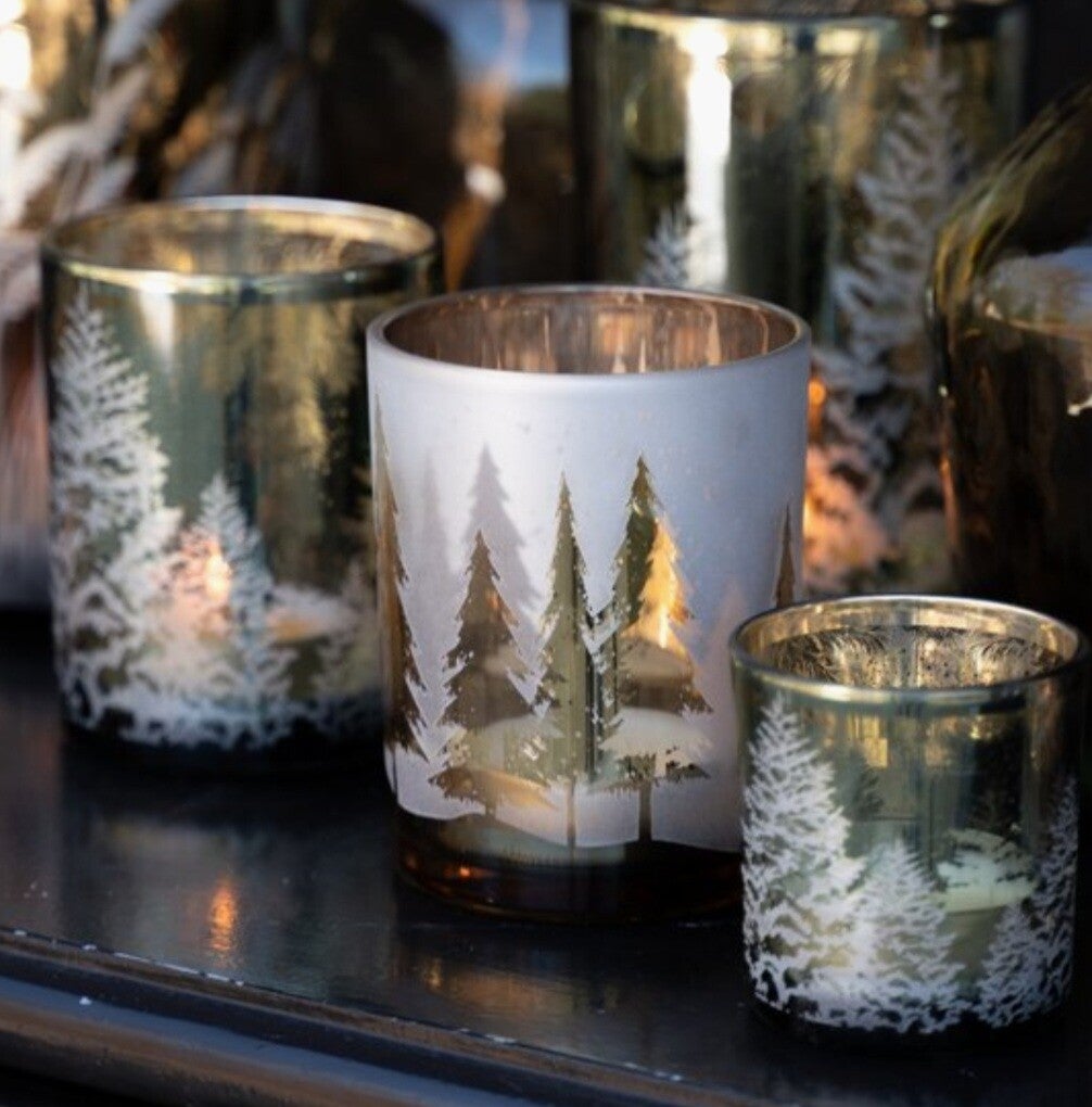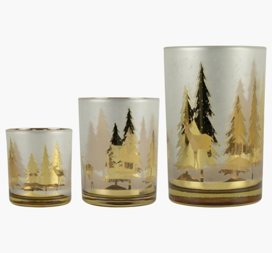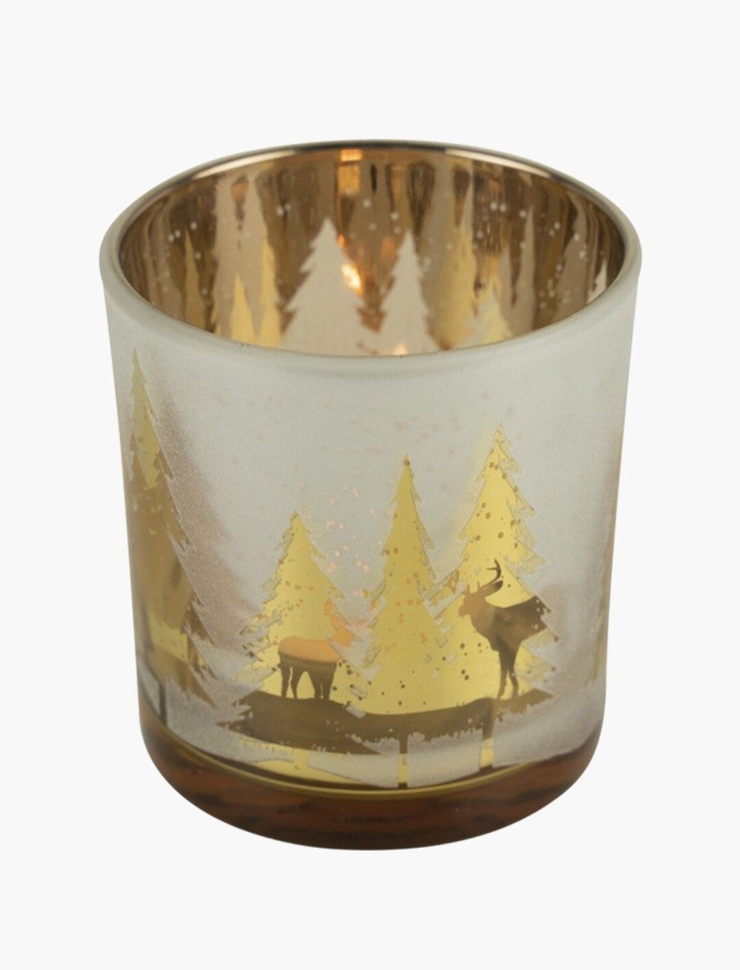 Laat je interieur schitteren met het Mars & More Windlicht Goud Bos & Hert. Deze elegante glazen windlichten zijn versierd met een prachtig winters tafereel van bomen, huisjes en herten in goudtinten. Zodra er een kaarsje in brandt, komt het motief tot leven en verspreidt het windlicht een warme, sfeervolle gloed.