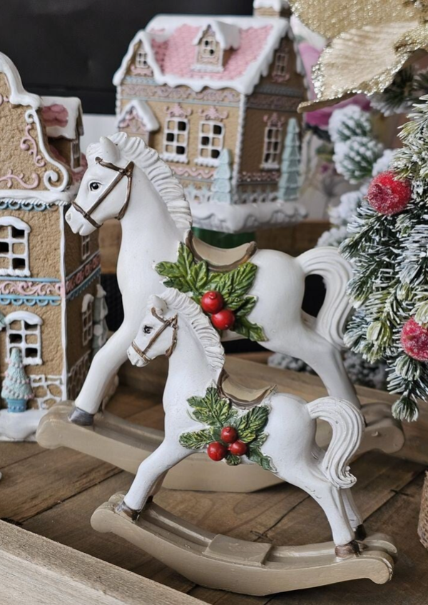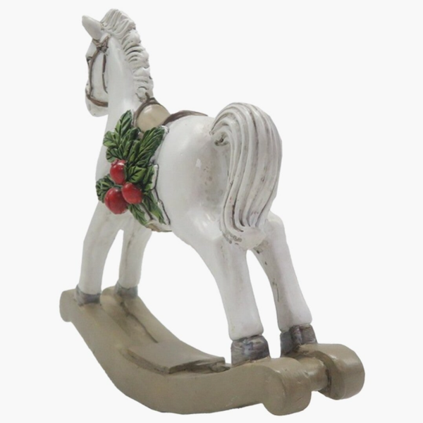 Laat je kerstdecoratie stralen met dit schattige witte hobbelpaard! Gemaakt van duurzaam polyresin, brengt het direct een vrolijke en feestelijke sfeer in huis. Zet het neer op een plank, vensterbank of dressoir, of geef het cadeau aan iemand die van knusse kerstdecoratie houdt. Een klein, speels accent dat je kerst helemaal compleet maakt!